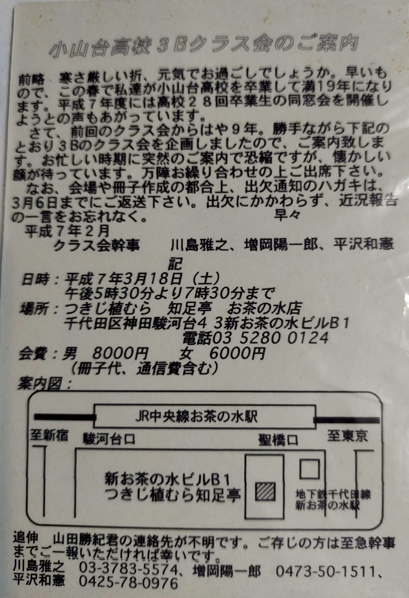 1995.3.18開催クラス会通知ハガキ(平澤くん保管)