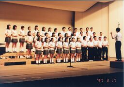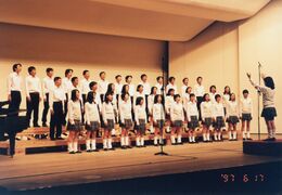 - 上記の目的により昭和45年に始まった合唱コンクールは初めの頃は予選、本選に分けて行われていました。本選に出場できるのは各学年3クラスのみで学年の枠を取り払っての審査のため常に3年生が1,2,3位を独占するという状態だったようです。昭和51年からは会場も学校の講堂から大田区民会館に移ったのを機に全学年が一堂に会し、まる一日かけての開催となりました。更に昭和53年からは審査を学年単位に順位をつけ表彰する形に変わり現在まで踏襲されています。